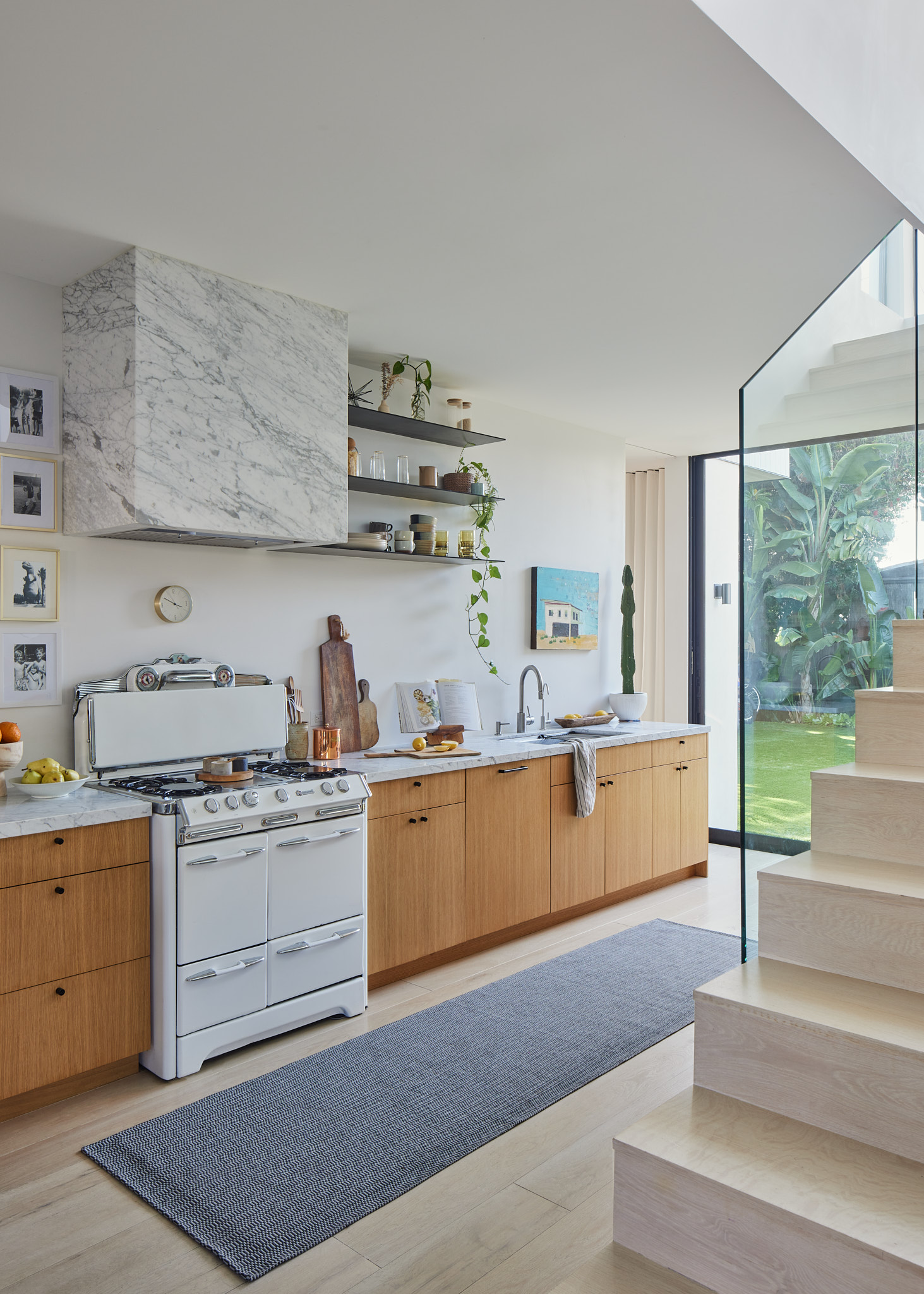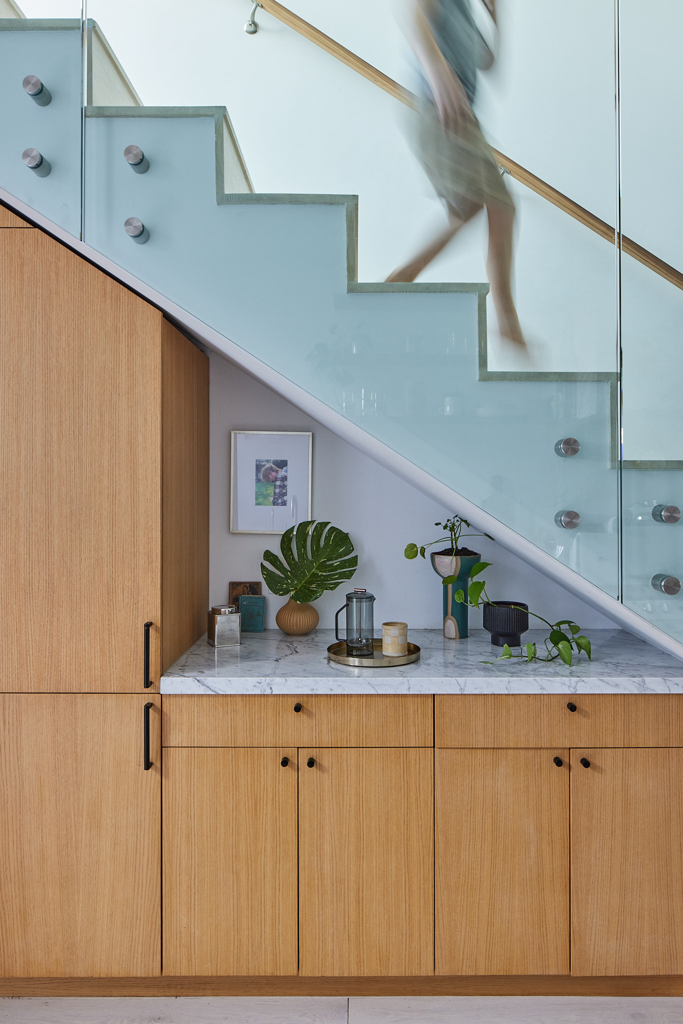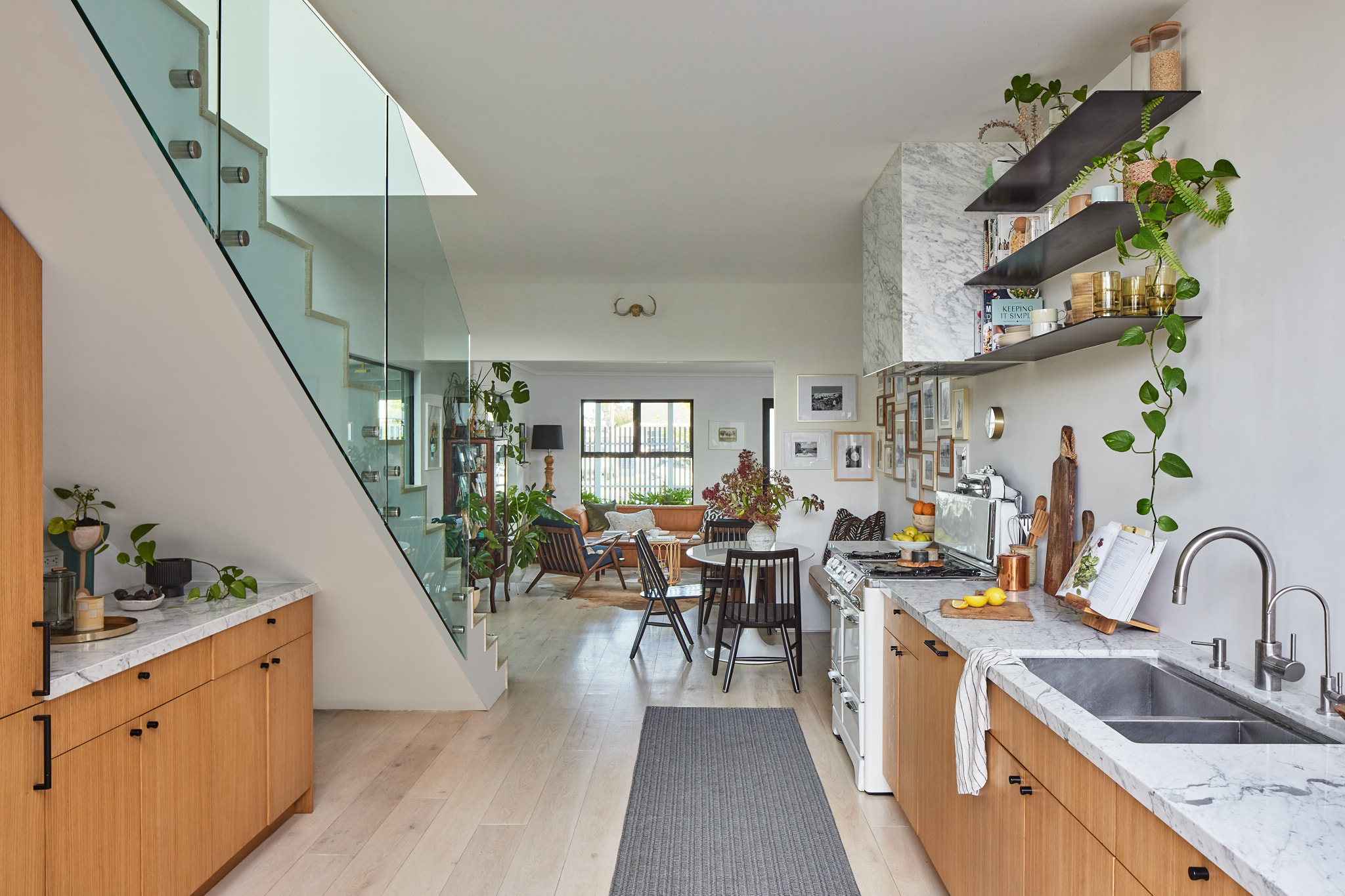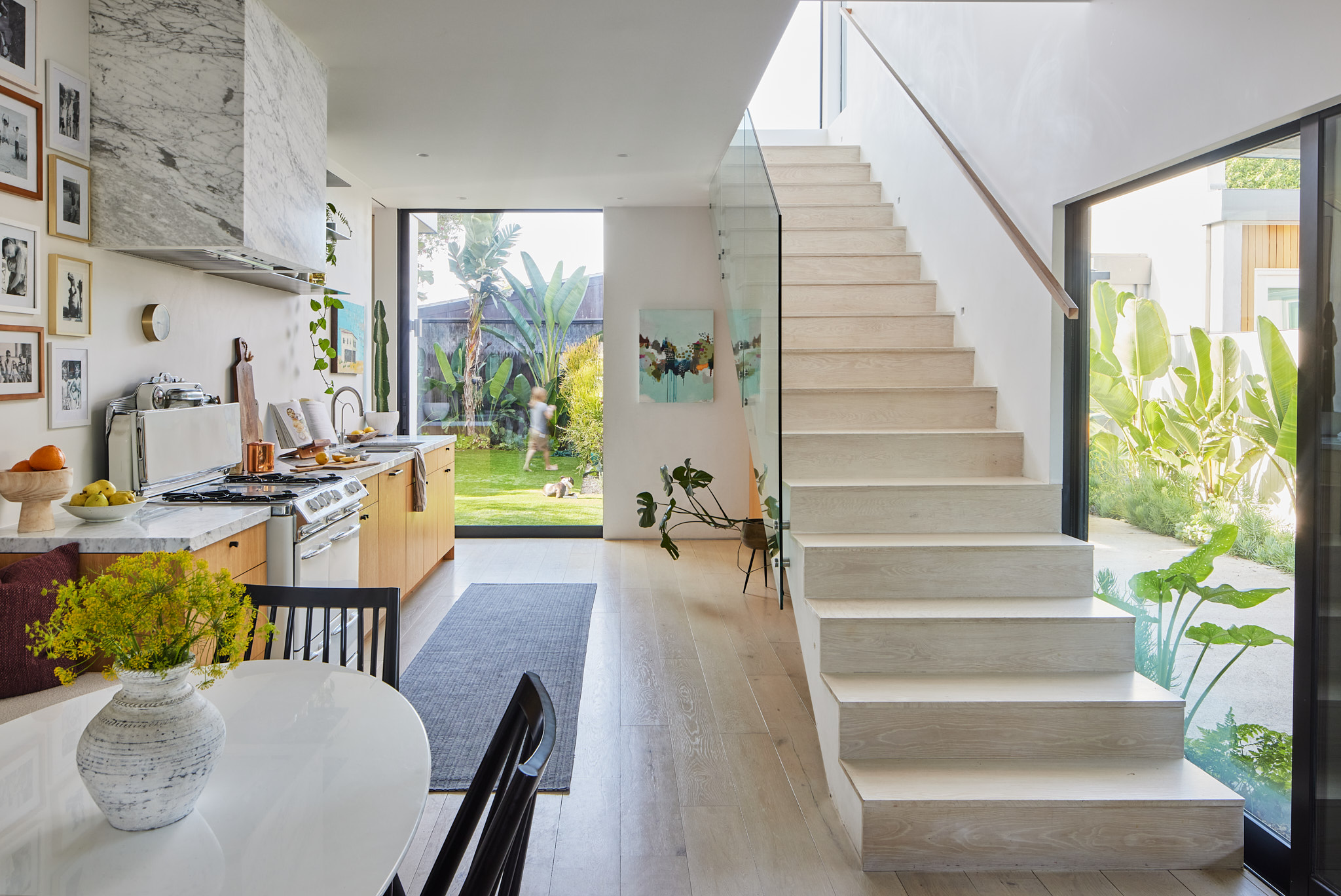 The strategic placement of the stairs adjacent to the kitchen, flanked by sliding doors, creates an expansive ambiance, seamlessly connecting the side exterior dining space, backyard, living room and kitchen all while avoiding any sense of obtrusion.