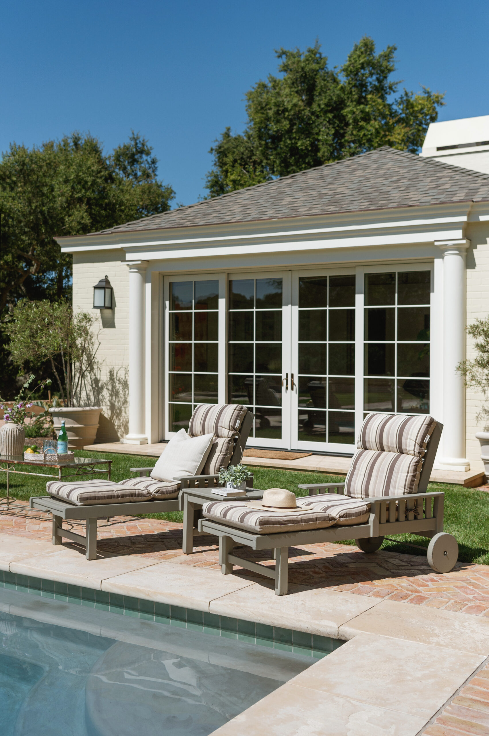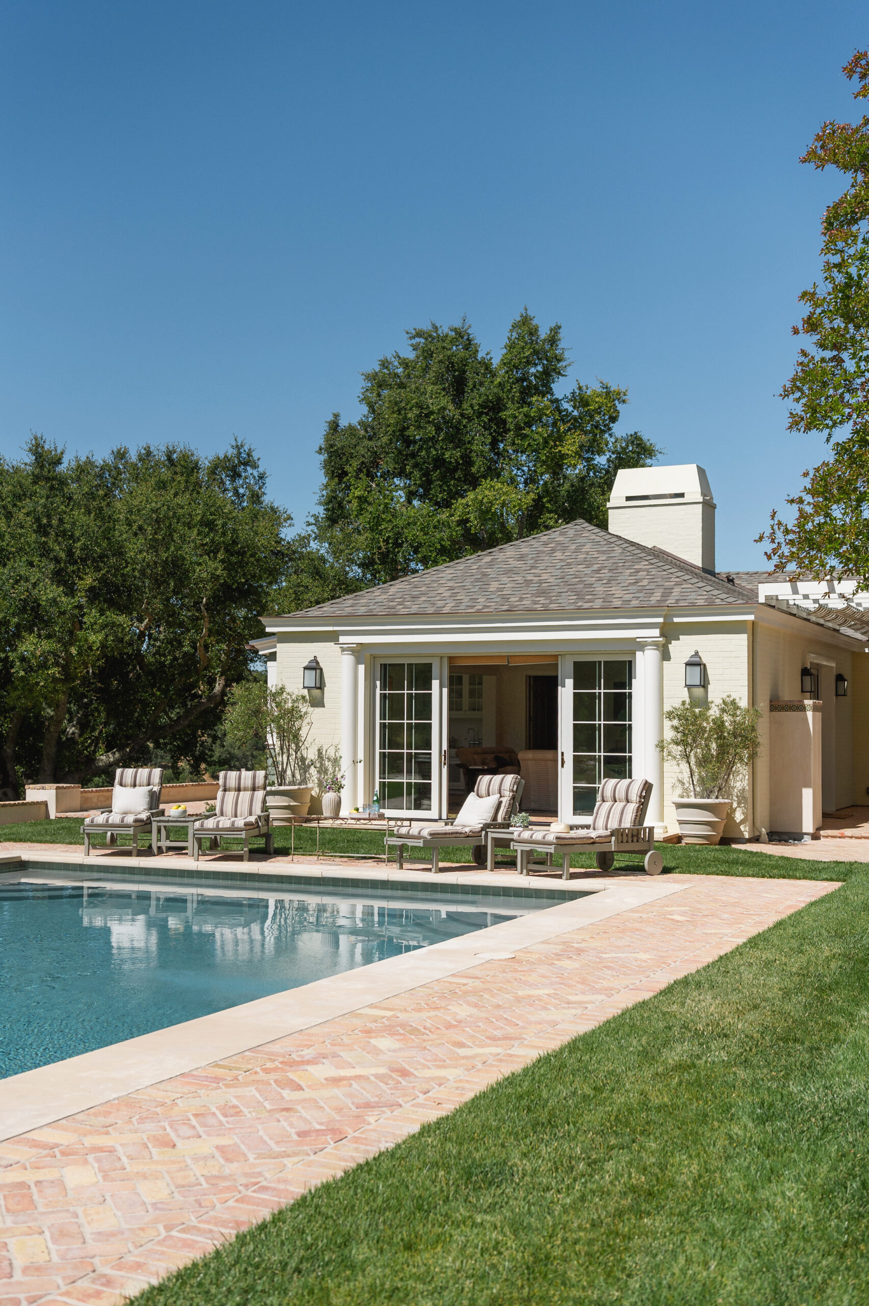 Nestled amidst the serene ambiance of oak trees, horse pastures, and a lake on a stunning estate near Los Olivos, California, stands this guest house/pool house, thoughtfully designed for family gatherings, entertainment, and basking in the breathtaking surroundings.