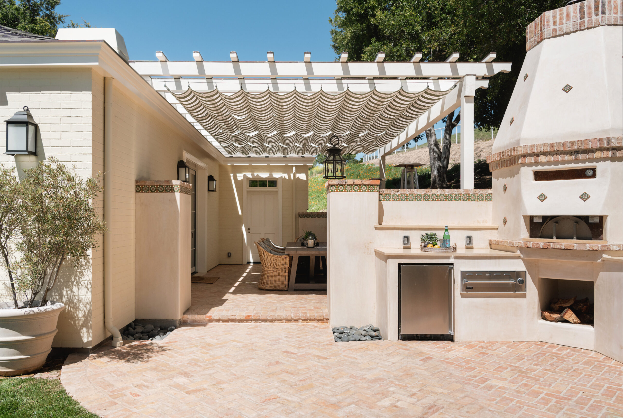 The exterior offers a picturesque setting for al fresco dining beneath a charming trellis, complete with a pizza oven and barbecue, making it the perfect setting for both relaxed family get-togethers and lavish poolside dinner parties.